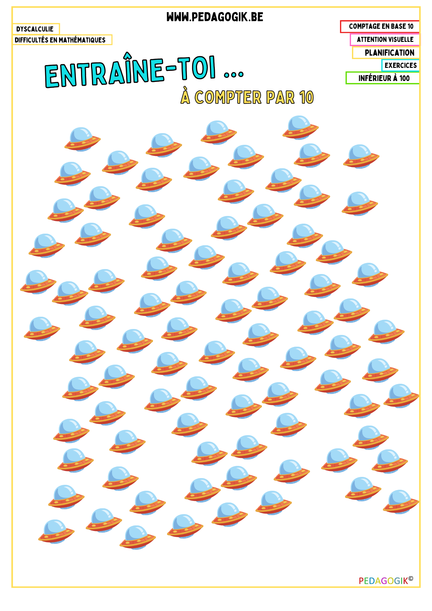 Voici une feuille qui permet de voir si l’enfant arrive à compter en base 10. Cet exercice est un bon indice qui permet de voir où en est l’enfant par rapport au comptage par 10
