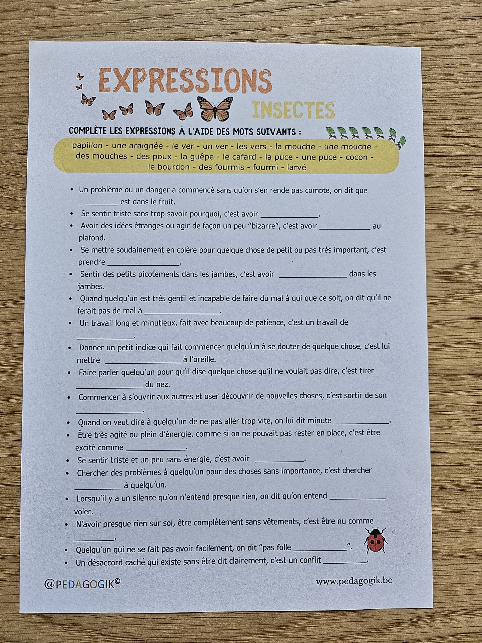 By - NajouaPosted on 29 mars 202629 mars 2026Posted in Feuille d'exercices, fiches/culture générale, fiches/expressions, fiches/français, FLE, Français, Lecture, outils, VocabulaireFeuille d’exercices avec les 18 expressions sur le thème des insectes Téléchargement du PDF exercices_insectes_pedagogik (1)Télécharger Expressions Partie 1 Expressions Partie 2 Expressions Partie 3